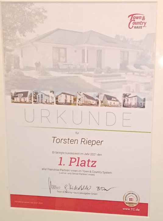 Wir freuen uns sehr, dass unser Kollege Torsten Rieper im Jahr 2021 bundesweit den 1. Platz unter allen Franchise-Partnerinnen und -Partnern im Town & Country Haus-System belegt hat.